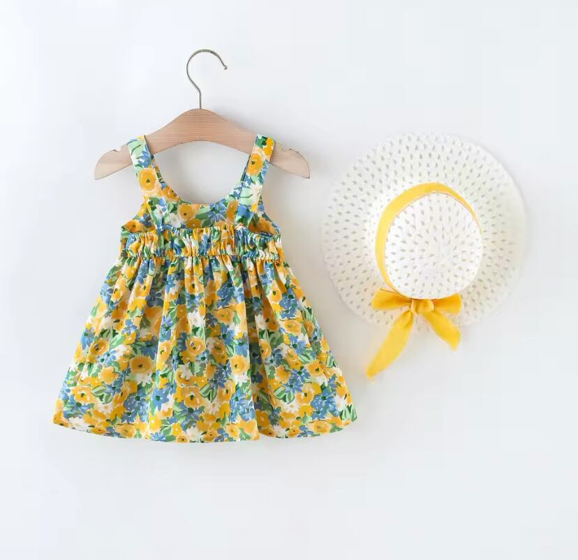 #0055 花柄ワンピース+ハット付き 2点セット
