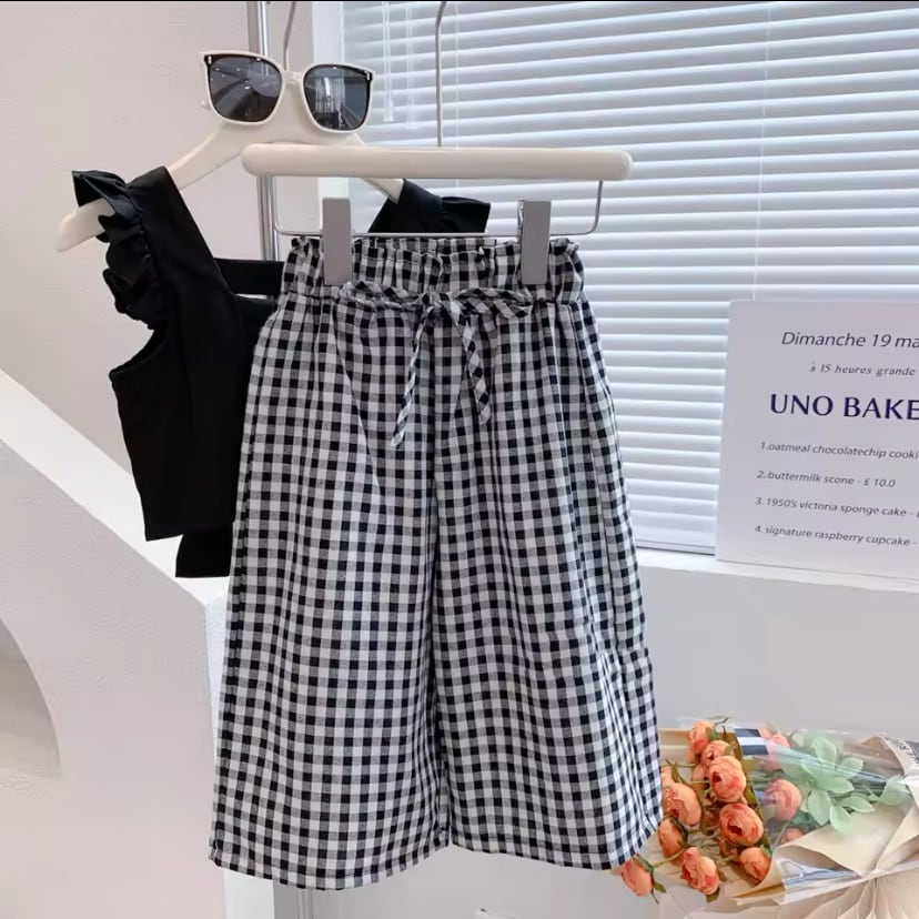 #0061 ブラックフリルキャミ+チェックパンツ 2点セット